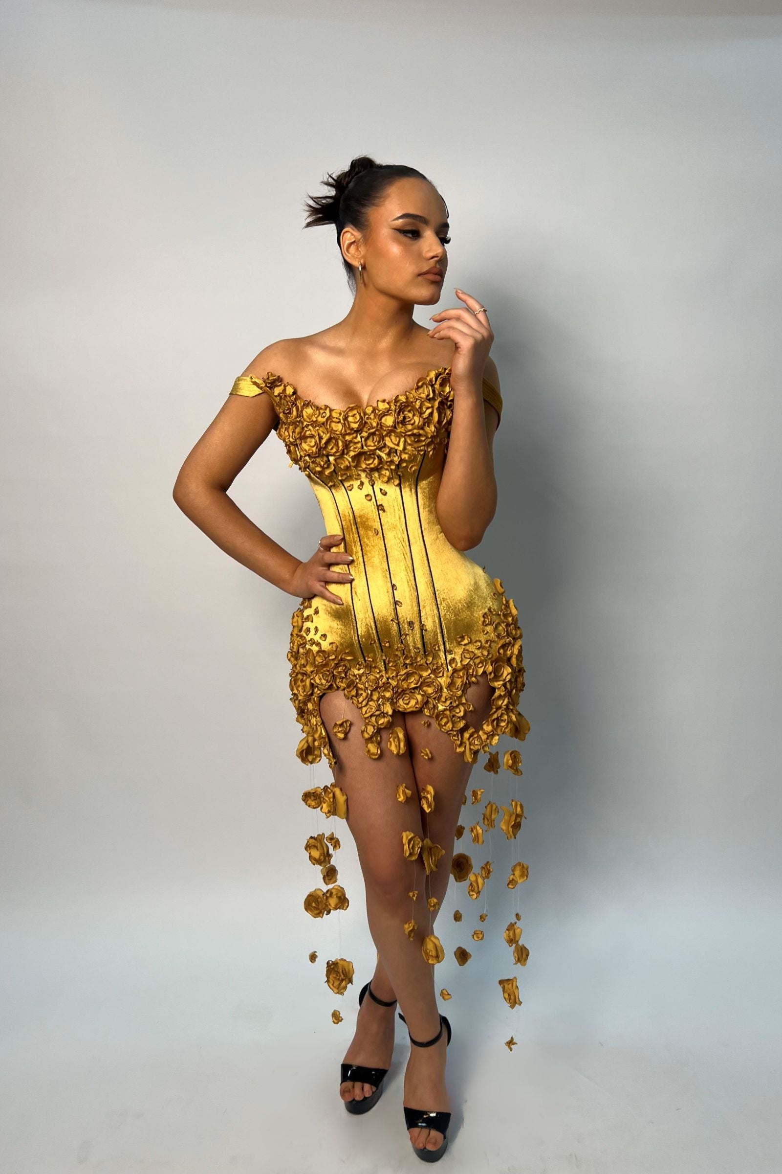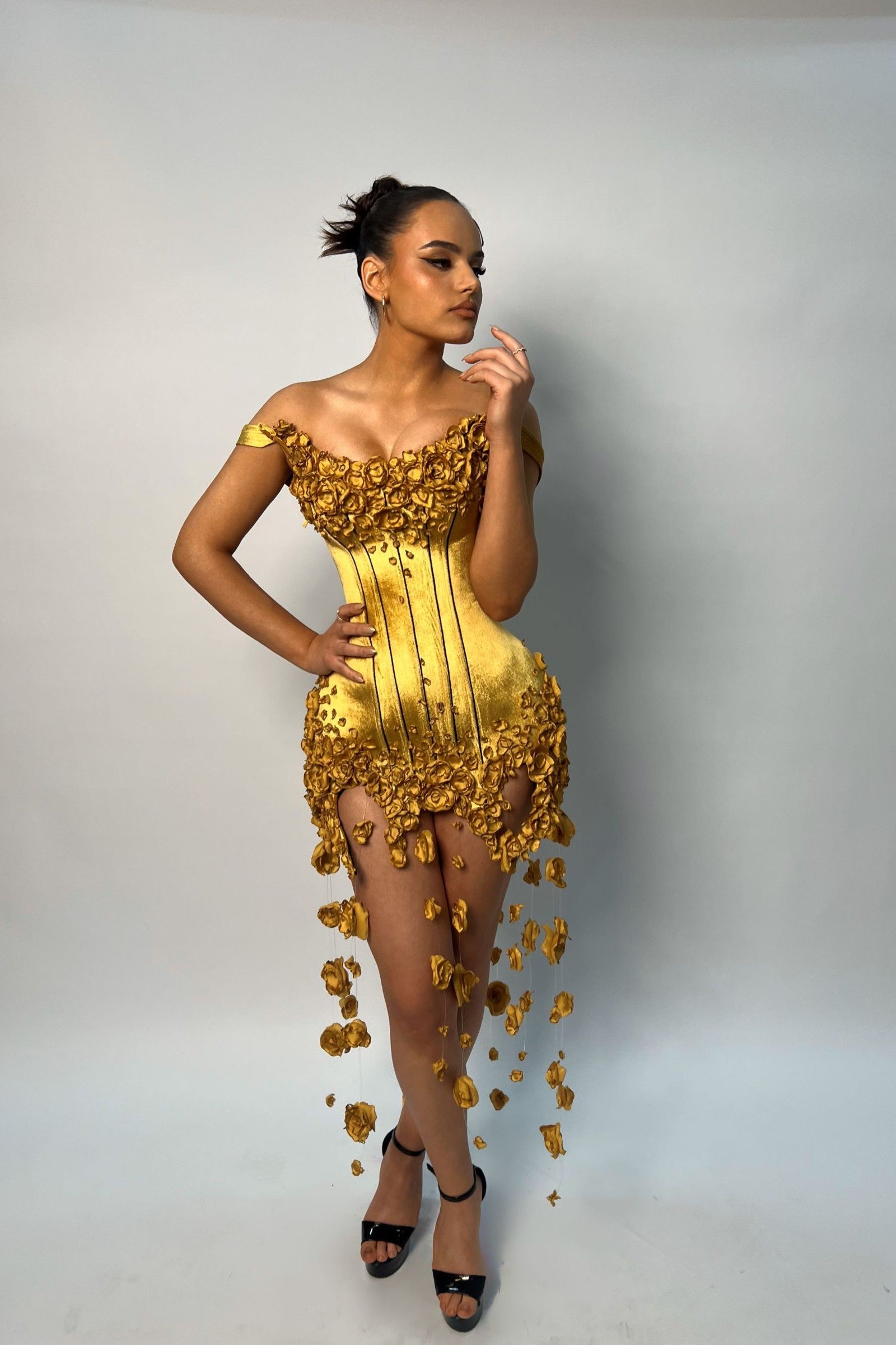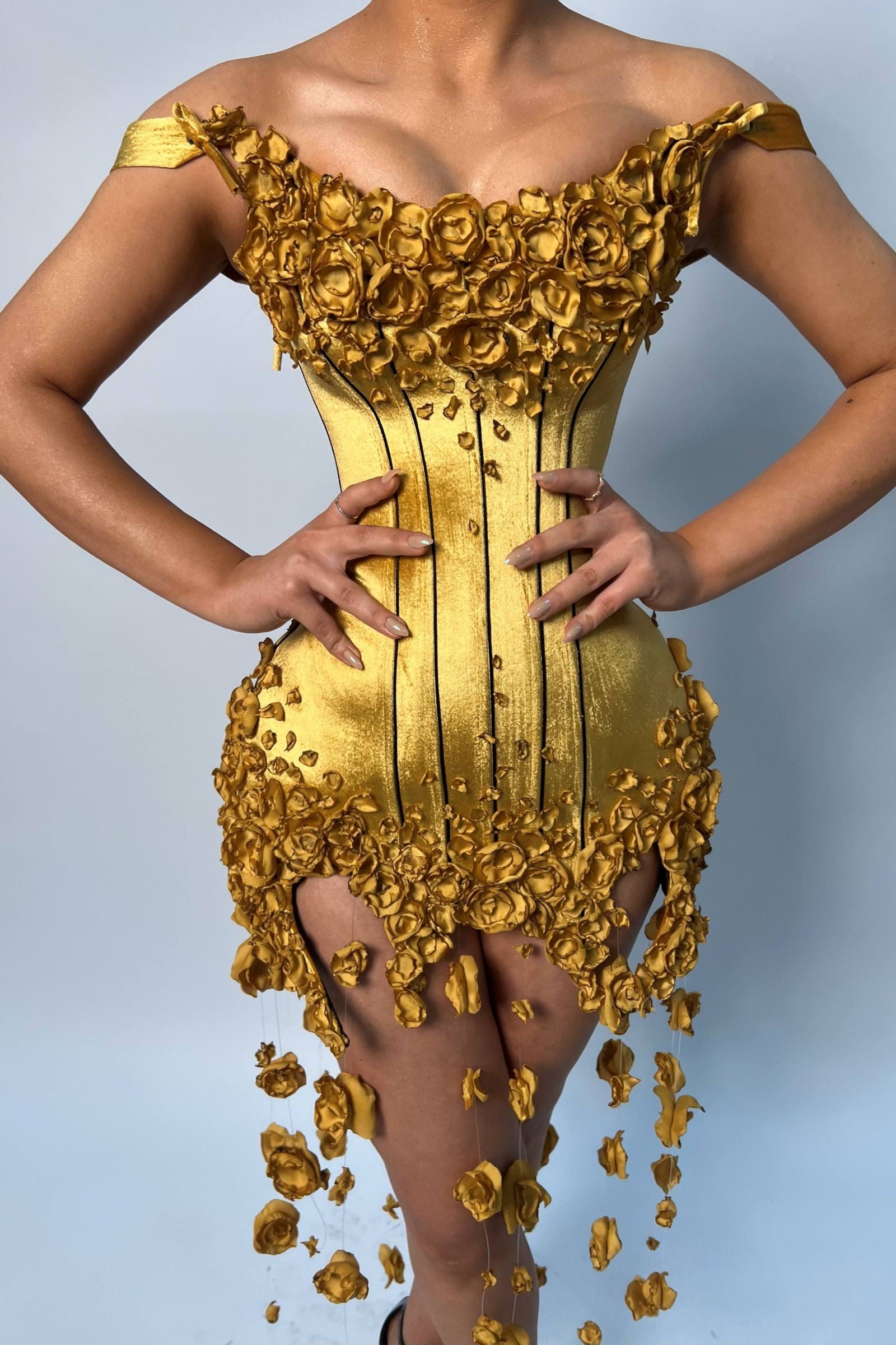 This mini corset dress features hand-applied satin roses on the bodice and hips, off-shoulder velvet straps, and 3D floral elements at the hem. Perfect for show-stopping events, stage performances, or high-fashion occasions. Made to order and delivered in 2 weeks.