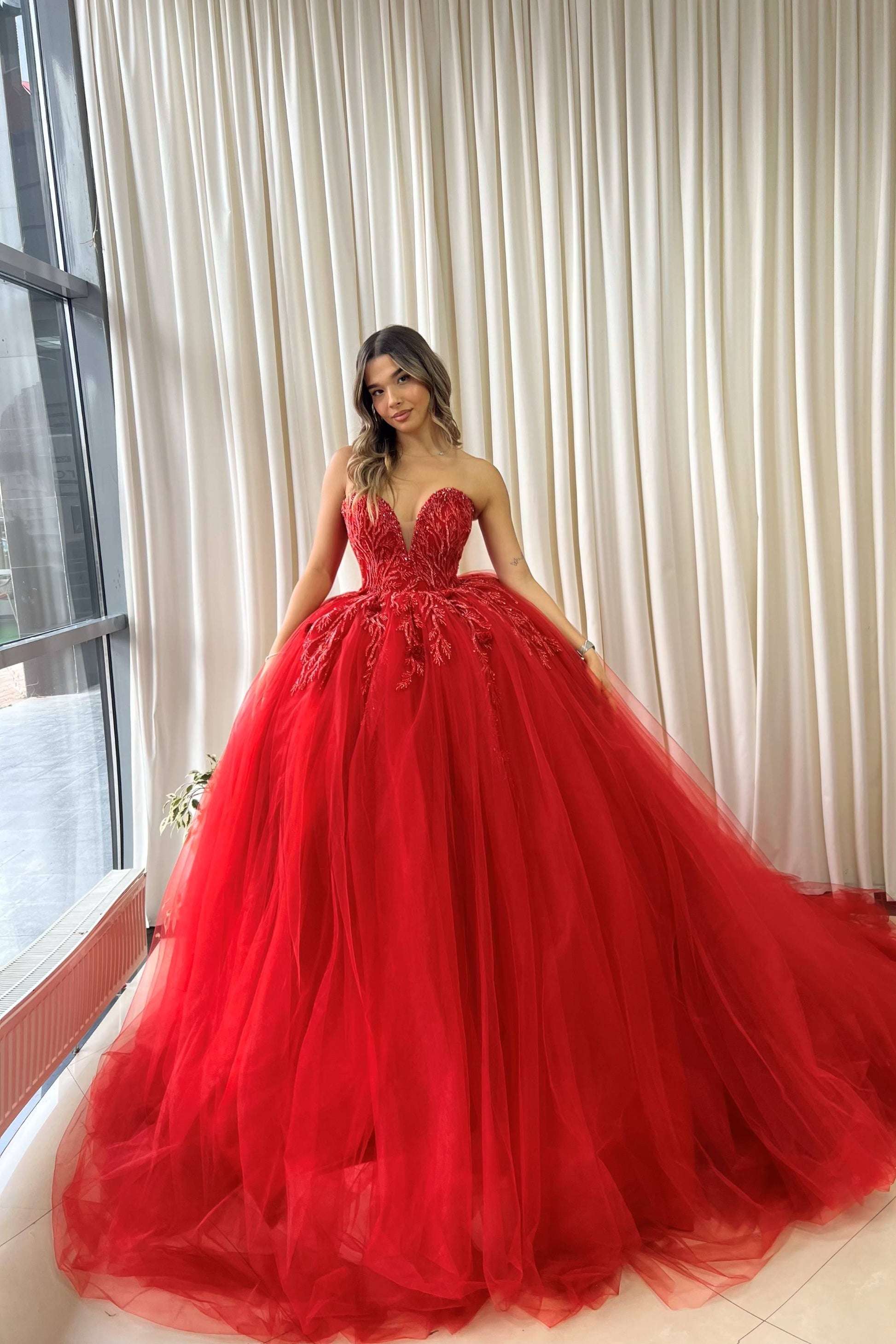 Be the belle of the ball in the Cherrylyn gown, a strapless stunner with a deep sweetheart neckline and structured bodice. Adorned with red floral embroidery and beading, this dress will surely make you stand out at any event. The multi-layered tulle skirt adds volume and drama, while the extended train adds an elegant touch. Perfect for galas or formal events. Made to order and delivered within 2 weeks.