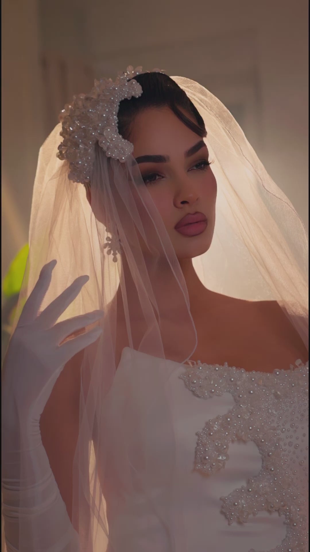 A modern bridal gown designed with a sleek silhouette and sculptural detailing. The dress features a smooth, satin-like base with a fitted form that follows the body’s contours. Floral beadwork is concentrated across the bodice and cascades asymmetrically, creating a textured focal detail. A high side slit offers movement and a clean, elongated line. The matching veil and gloves complete the look with a soft, delicate finish.