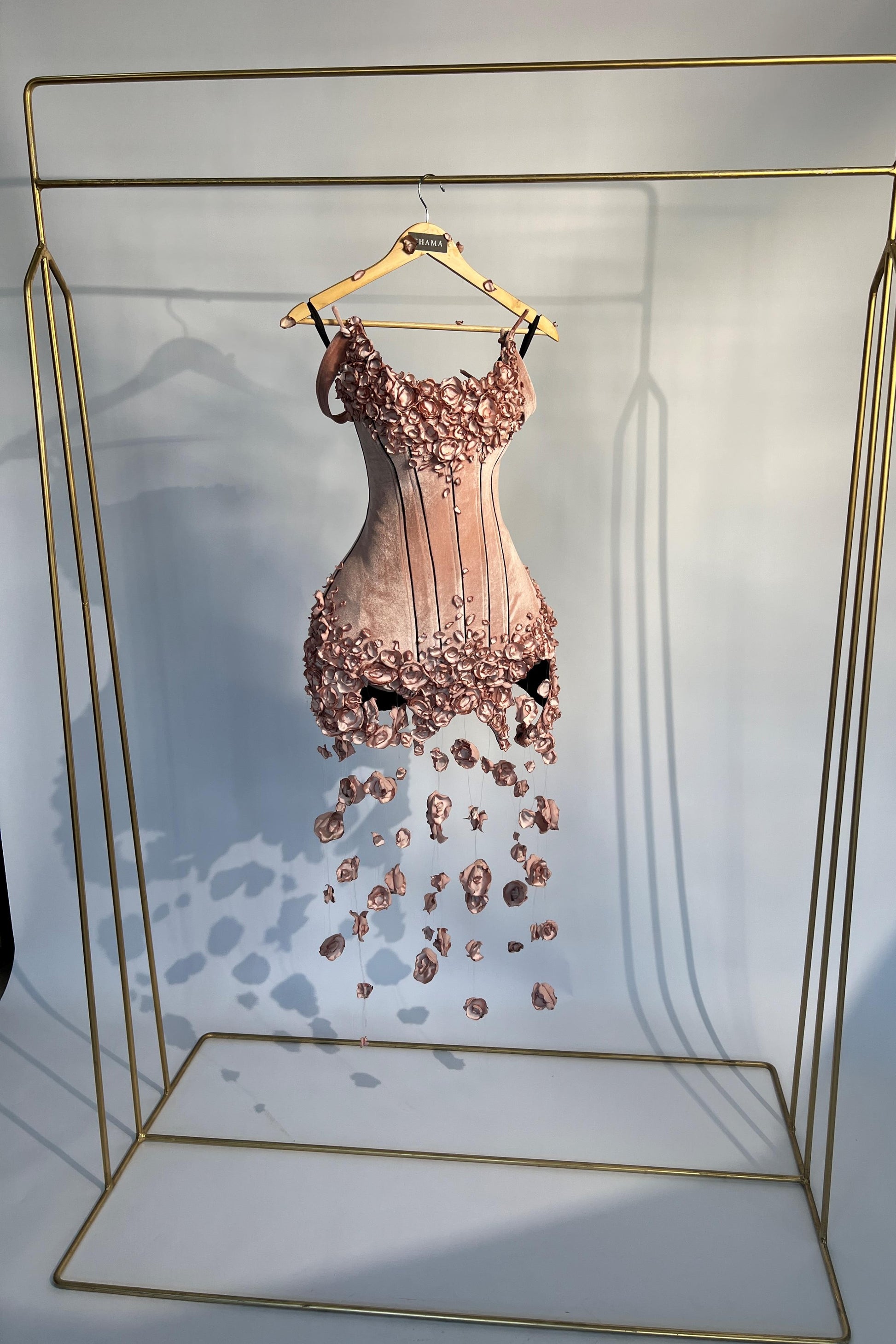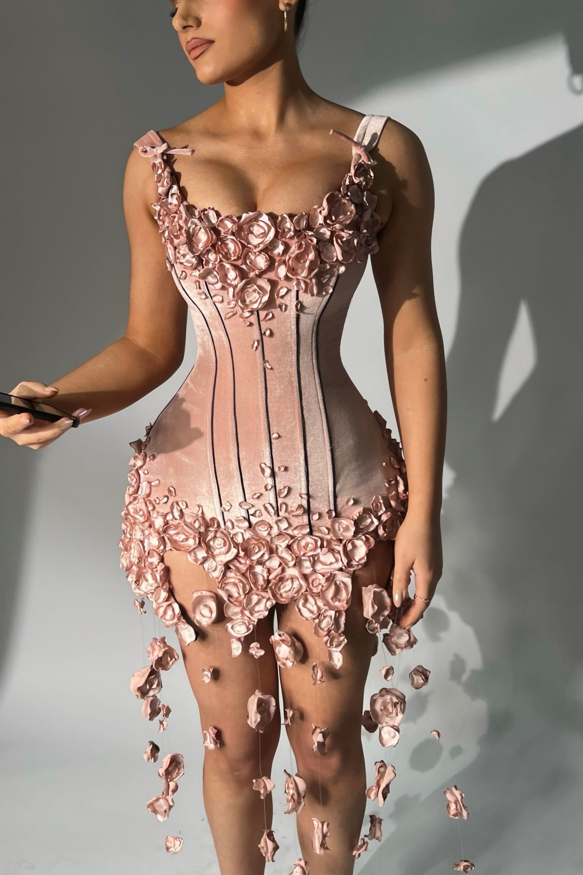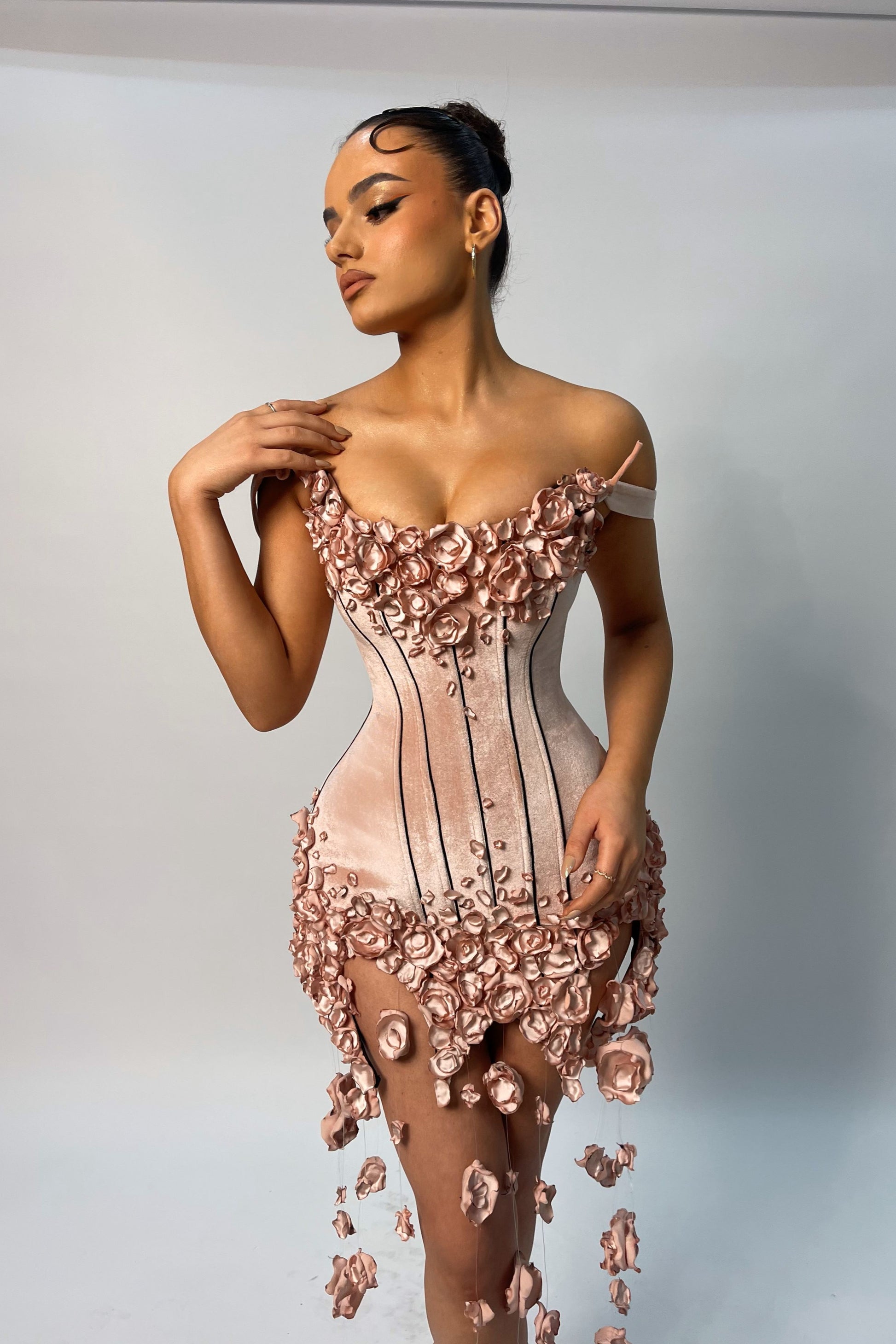 Elegant blush satin corset with hand-placed floral details. Perfect for special occasions or photo shoots. Made to order, delivered in 2 weeks.