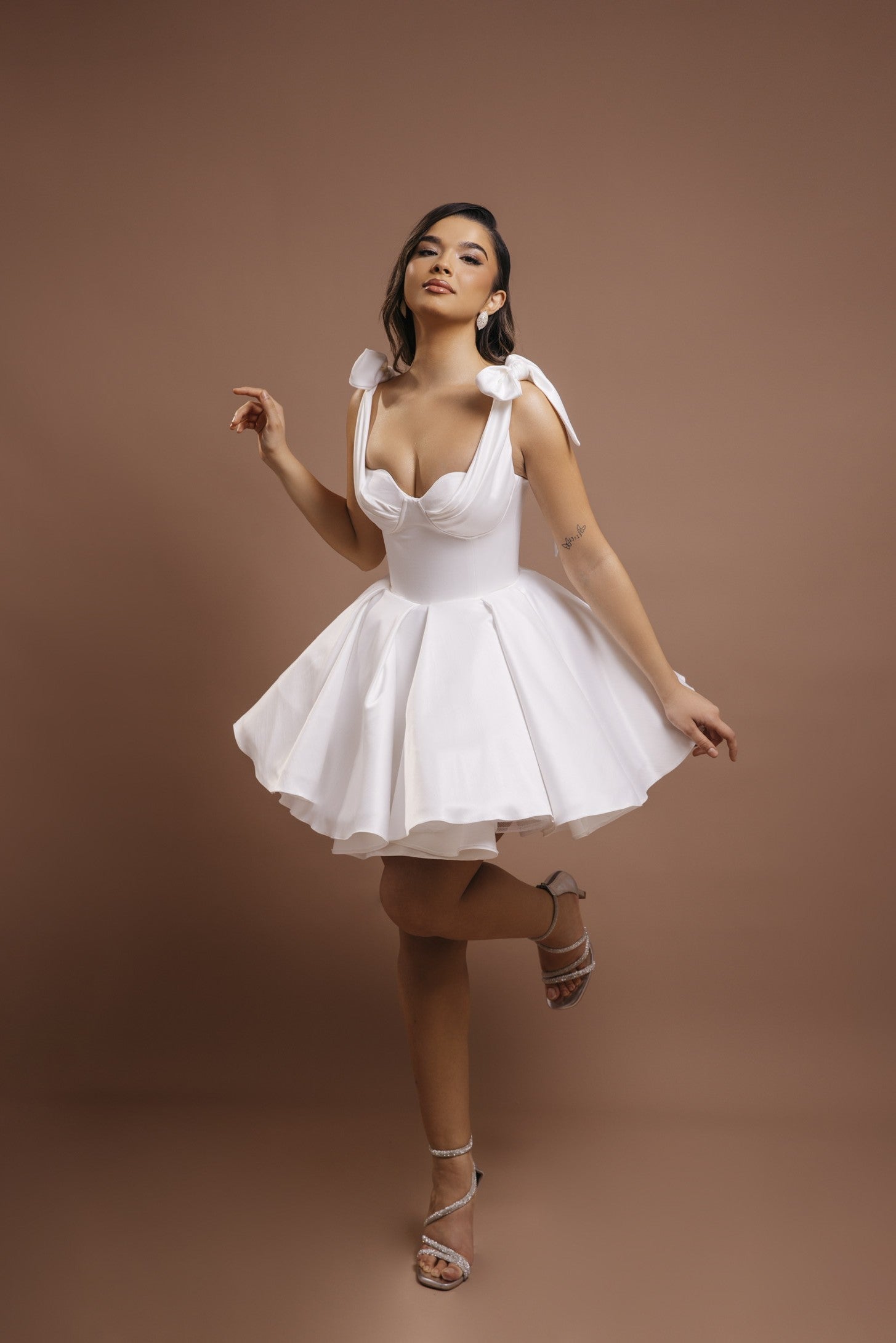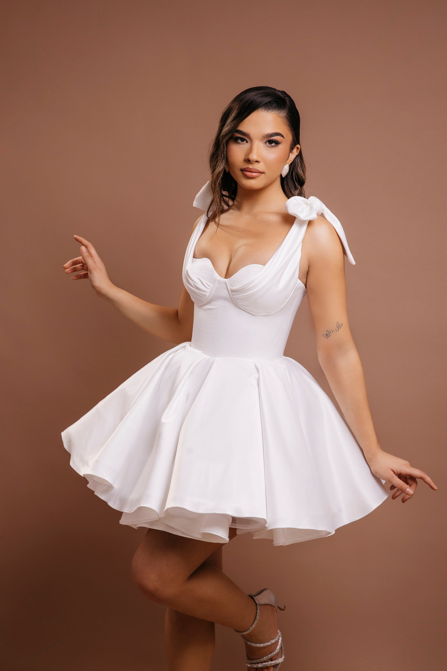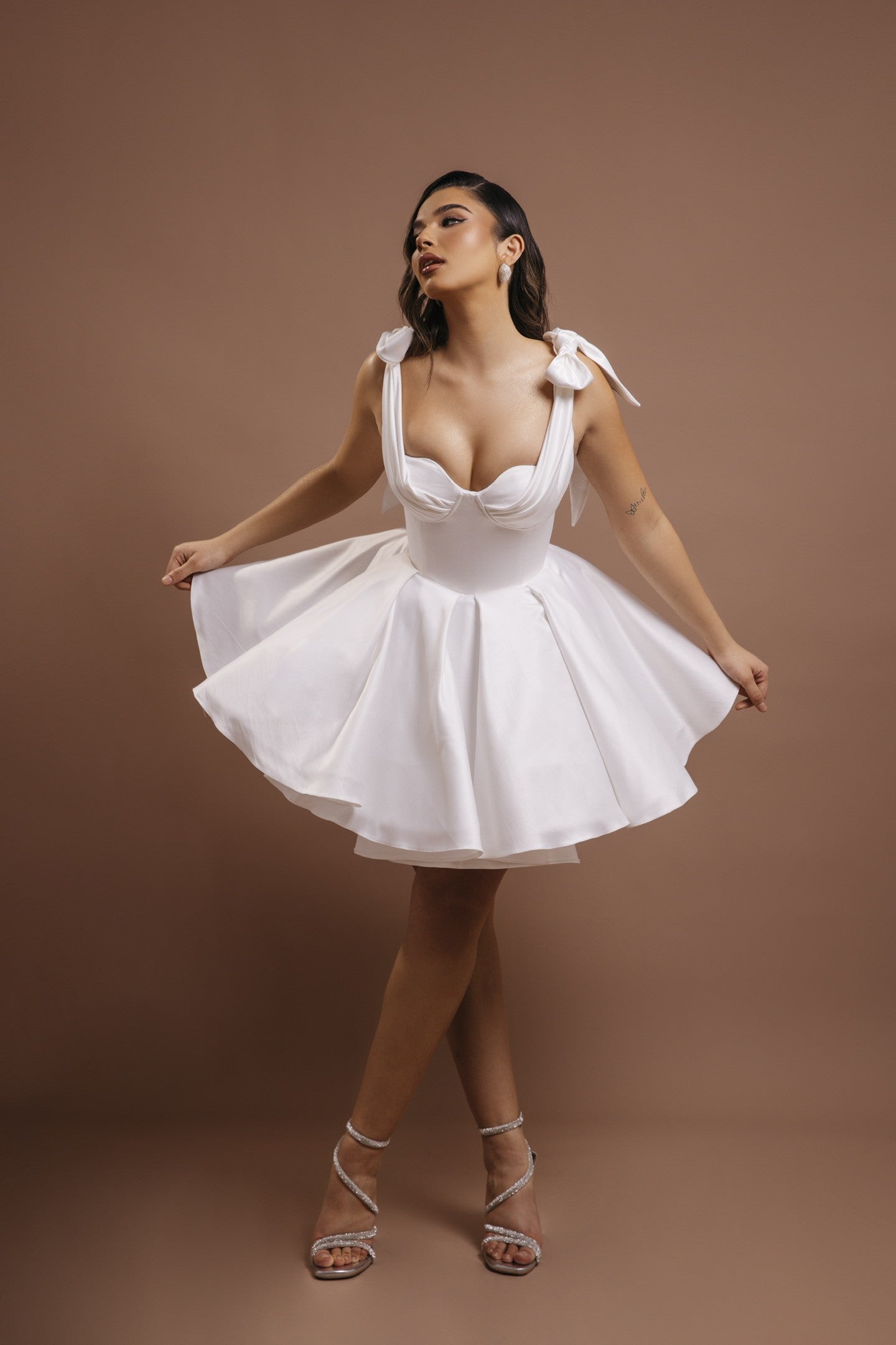 Custom-made crisp white mini dress with fitted bodice and flared skirt. Features draped bust and adjustable bow-tied shoulder straps. Ideal for engagement events and bridal showers. Delivery within 2 weeks.