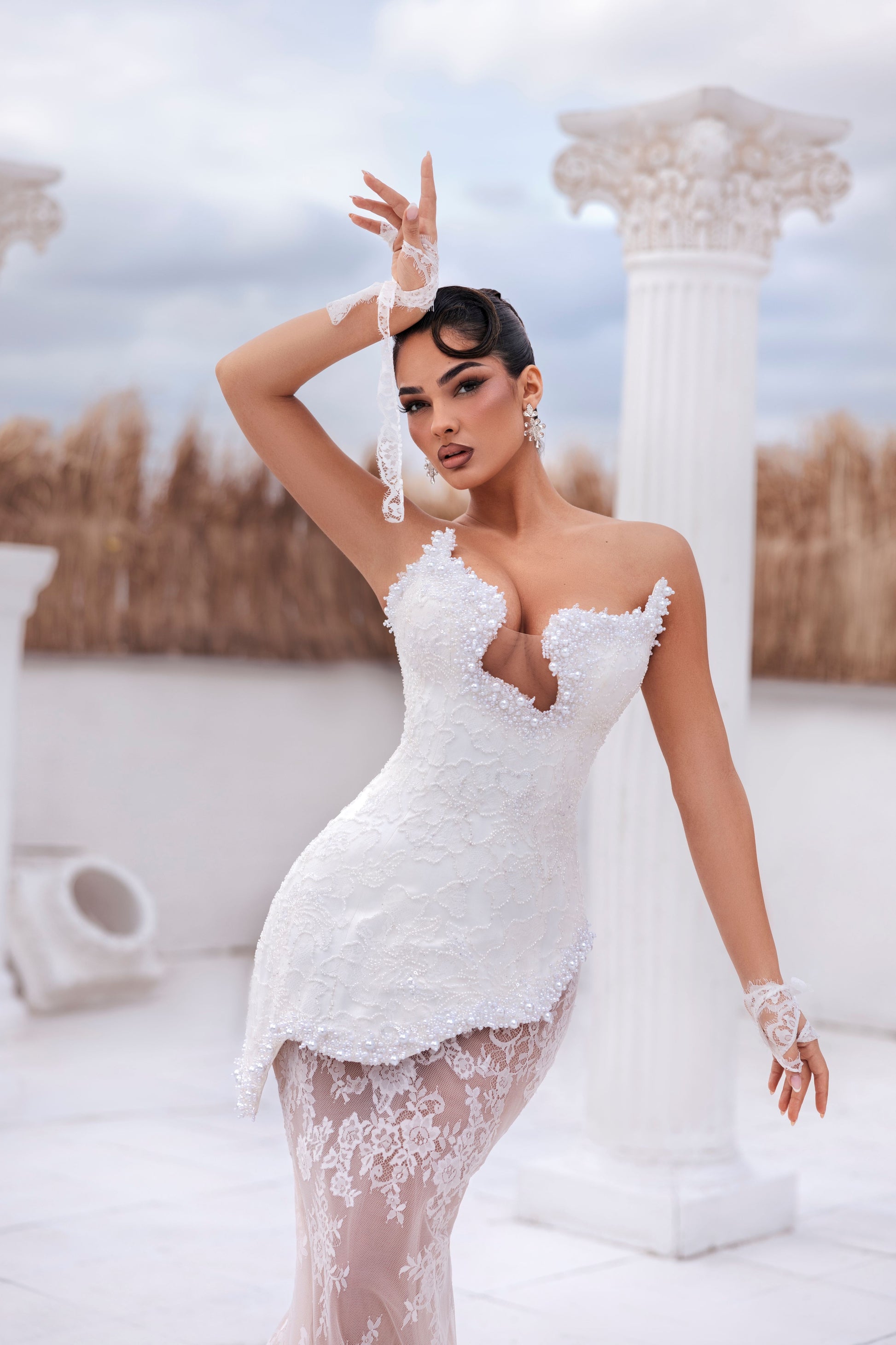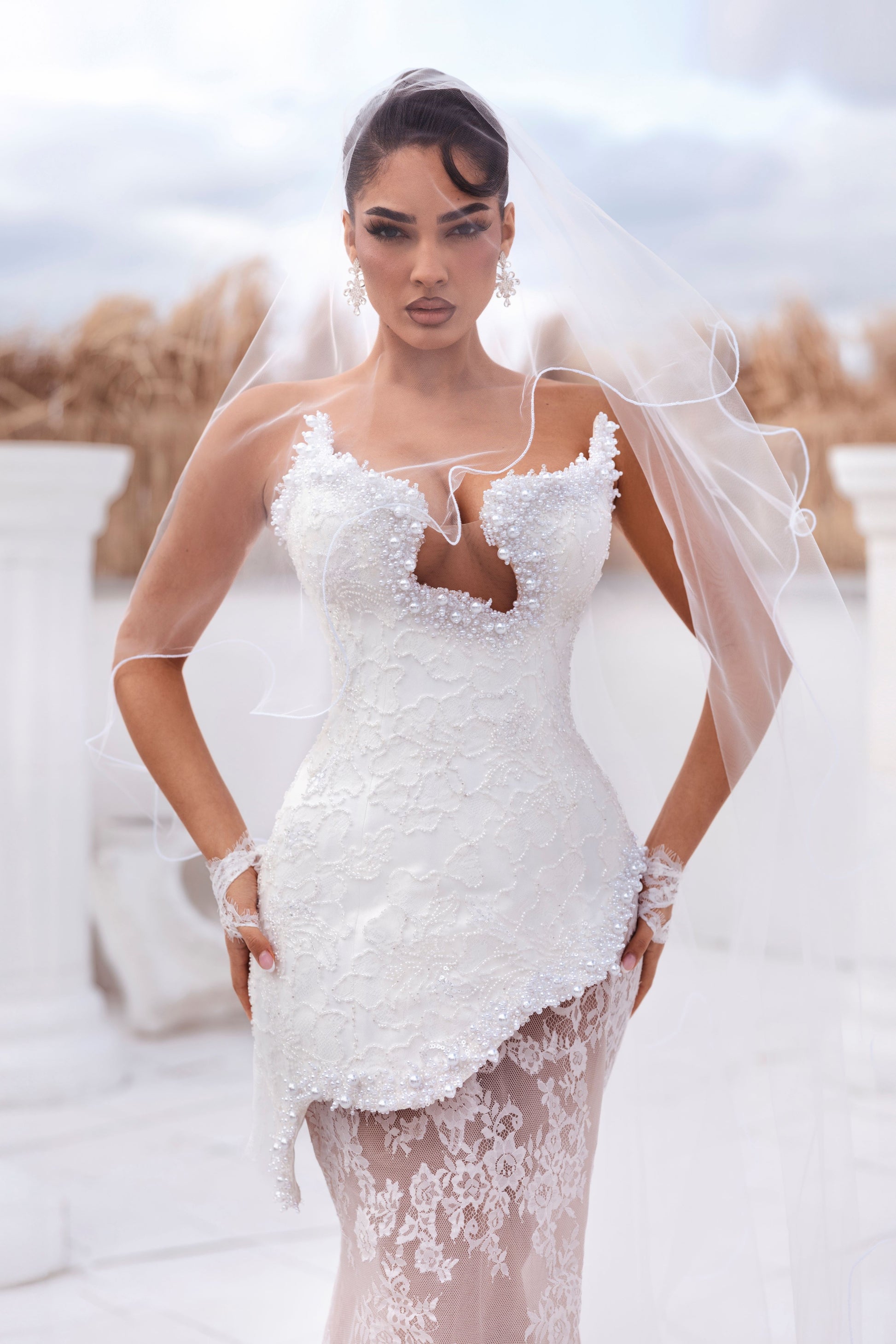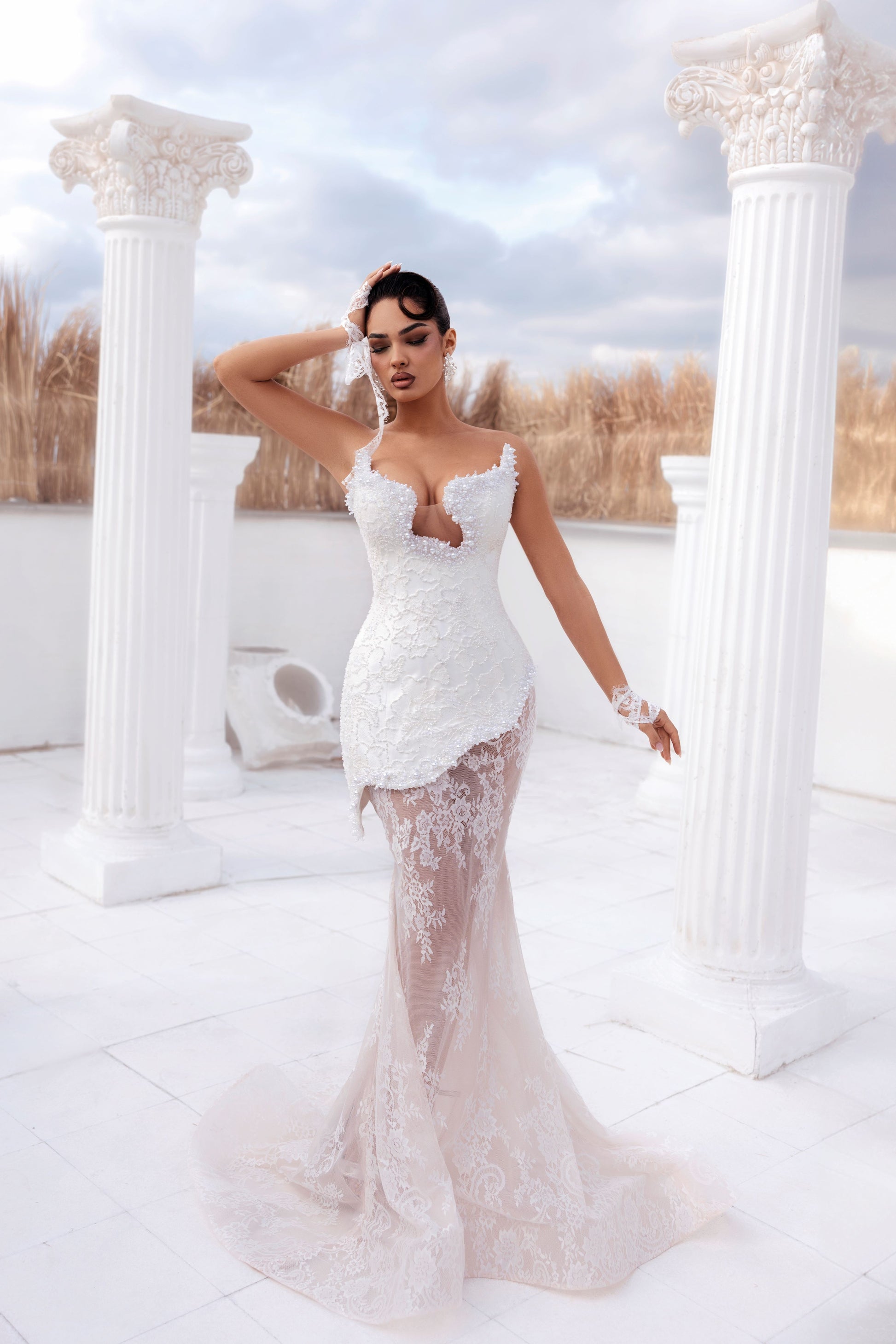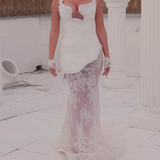 Indulge in the ethereal beauty of Lusea, a sculpted mermaid silhouette adorned with delicate floral lace. The structured corset bodice, with its deep sweetheart neckline and 3D floral detailing, accentuates the waist while the asymmetrical lace peplum adds volume. The sheer skirt features elegant lace embroidery, trailing into a soft train. Each one is made to order and delivered within three weeks, ensuring a bespoke experience for the discerning individual.