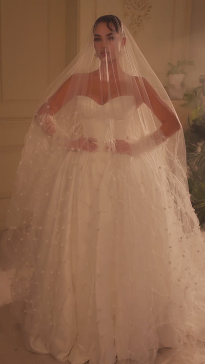 This wedding dress features a structured upper fit that shapes the waist and neckline with clean, defined lines. The skirt is full and rounded, creating volume and a smooth, flowing silhouette that extends into a long train at the back. The matching veil has delicate dotted detailing, and the sheer gloves complete the look with a refined finishing touch.