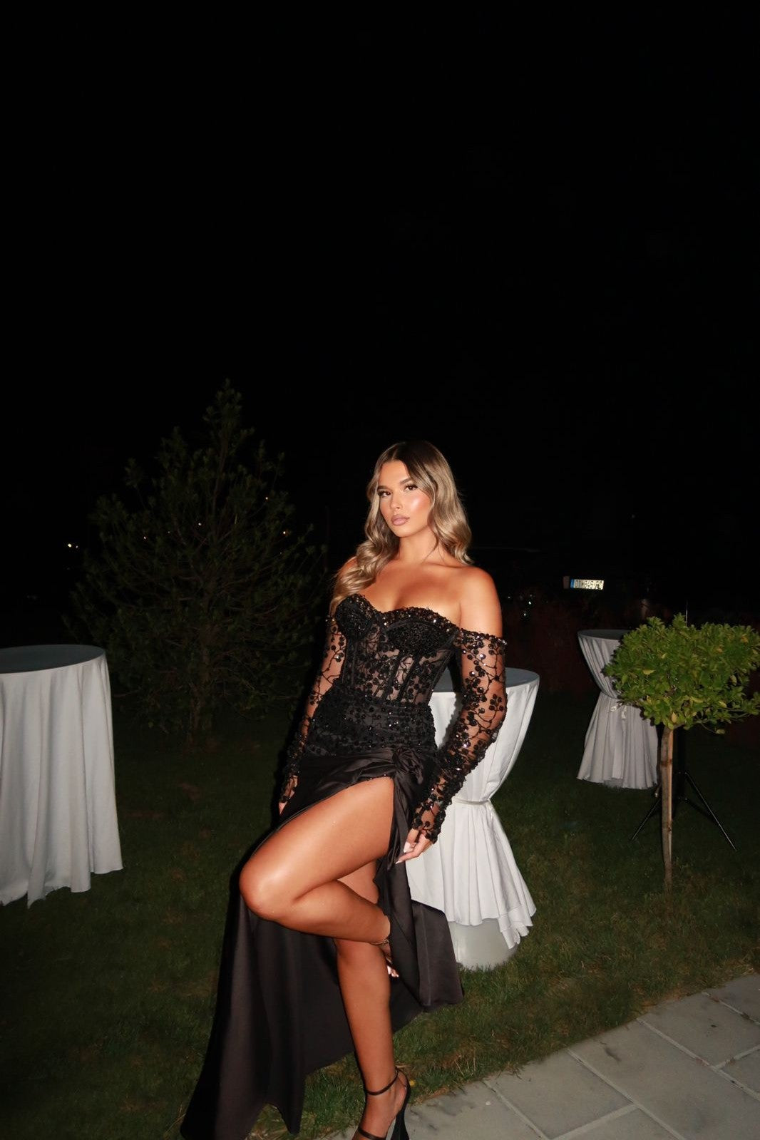 Unleash your bold and playful side with Moréa, the off-shoulder corset gown. Featuring a sheer bodice with hand-applied floral detailing, this dress also provides a sculpted silhouette with its boned structure and illusion sleeves. Complete with a draped satin skirt, high slit, and ruched hip detailing, Moréa is the perfect statement piece for any formal evening or luxury event. Made to order and delivered within 2 weeks.